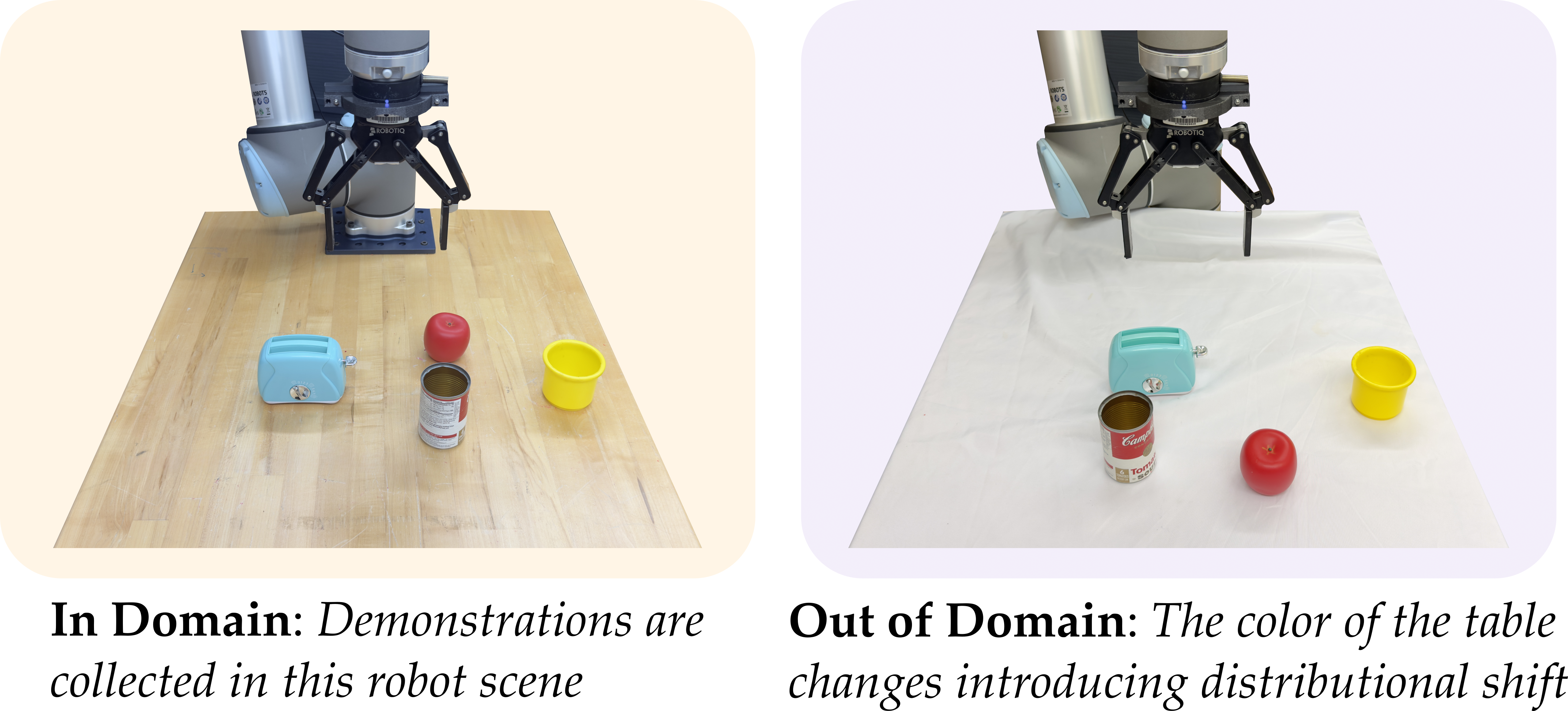 We evaluate in three table-top manipulation tasks: Pick, Stack, and Scoop. For each task, the training demonstrations are collected exclusively in the robot scene with a wooden table. We call this scene In Domain (ID) because during evaluation observations from this scene lie in the training set. Next, we evaluate the policy in a different robot scene where the table is covered with a white sheet. This scene is labeled Out of Domain (OOD) as the change in the background introduces significant distributional shift in the image observations. We show that our method, which extracts task-relevant features from the observations while suppressing irrelevant features, learns a policy that is robust to these environmental disturbances.