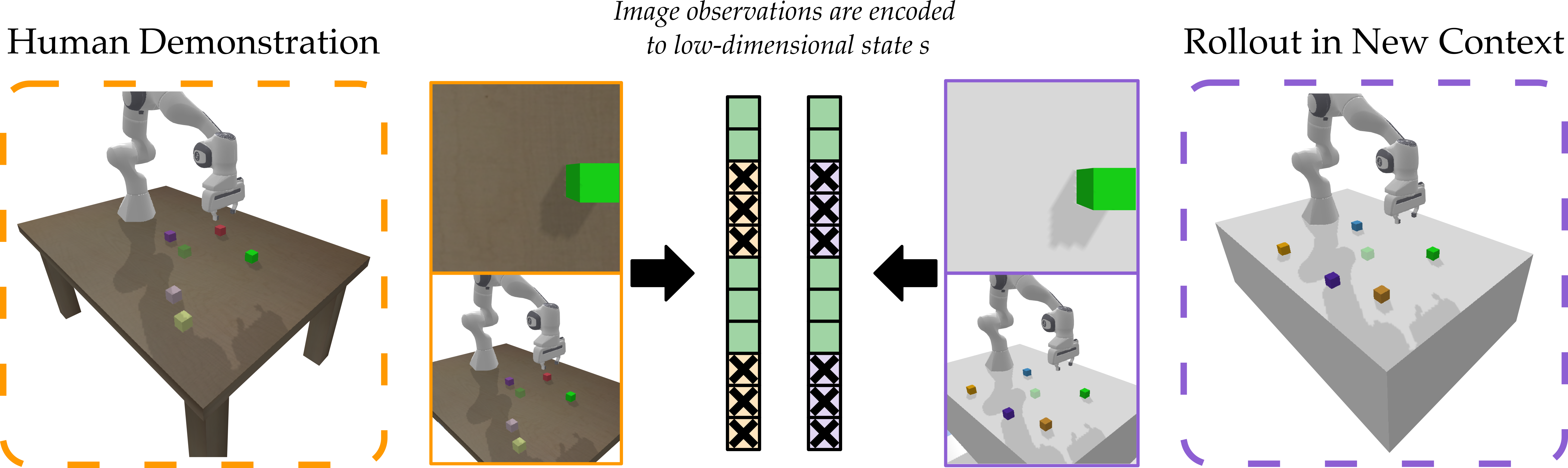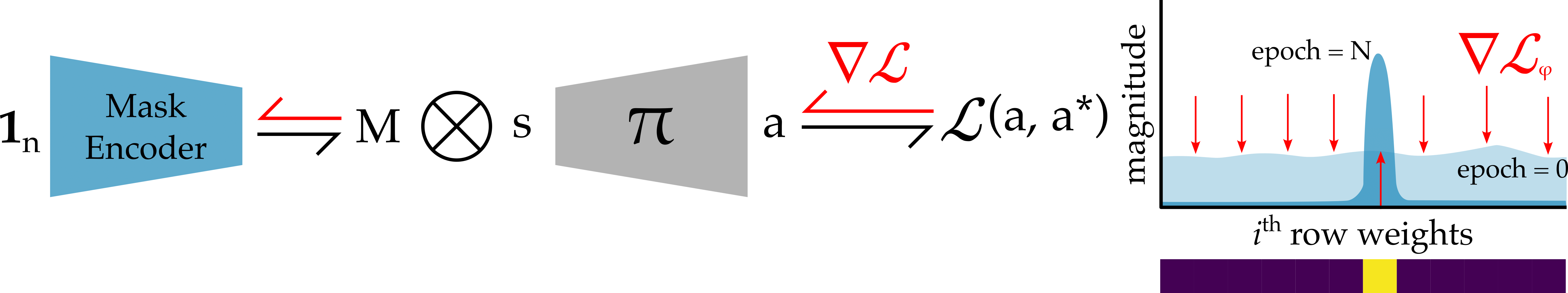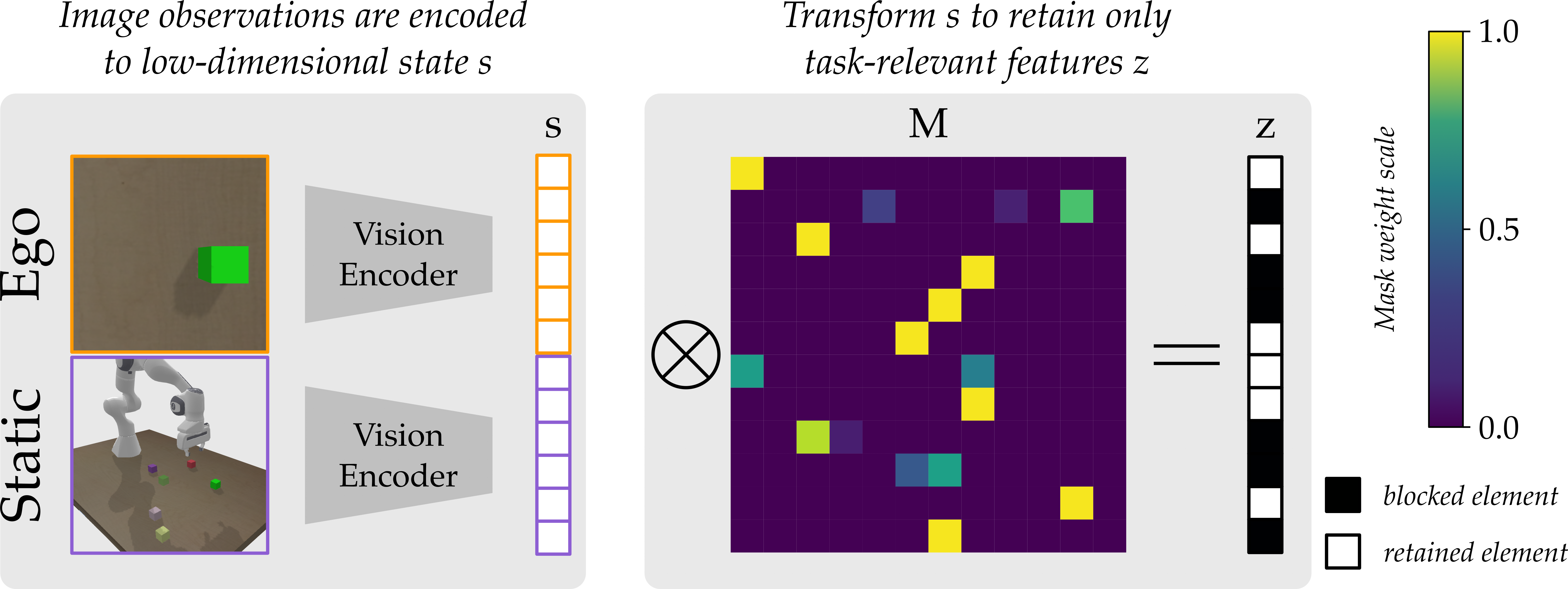 We parameterize the mask matrix \(M\) with a learnable parameter \(\theta\). We train TransMASK with the standard imitation learning objective \(L(\psi, M) = \sum_{(s, a) \in \mathcal{D}} \frac{1}{2} \| \pi_\psi(M s) - a \|^2\), where the state \(s\) can be privileged information (i.e., exact location of the objects) or disentangled features obtained from image observations. The policy \(\pi\), parameterized by \(\psi\), is conditioned on the state representation \(z = M s\) instead of the state. Our insight is: since the expert's actions are exclusively influenced by information critical to the task, the Jacobian of the expert policy will have higher values in columns corresponding to task-relevant elements of \(s\) and near zero for columns corresponding to task-irrelevant elements. As training converges, the robot policy \(\pi\) approaches the expert policy and its Jacobian approaches the same sparse structure. During optimization, the gradients of \(\pi\) change parameters \(\theta\) such that each row of \(M\) emphasizes task-relevant elements of \(s\) while suppressing irrelevant ones. This learned mask then transforms the state into a representation that completely removes the extraneous information about the environment.